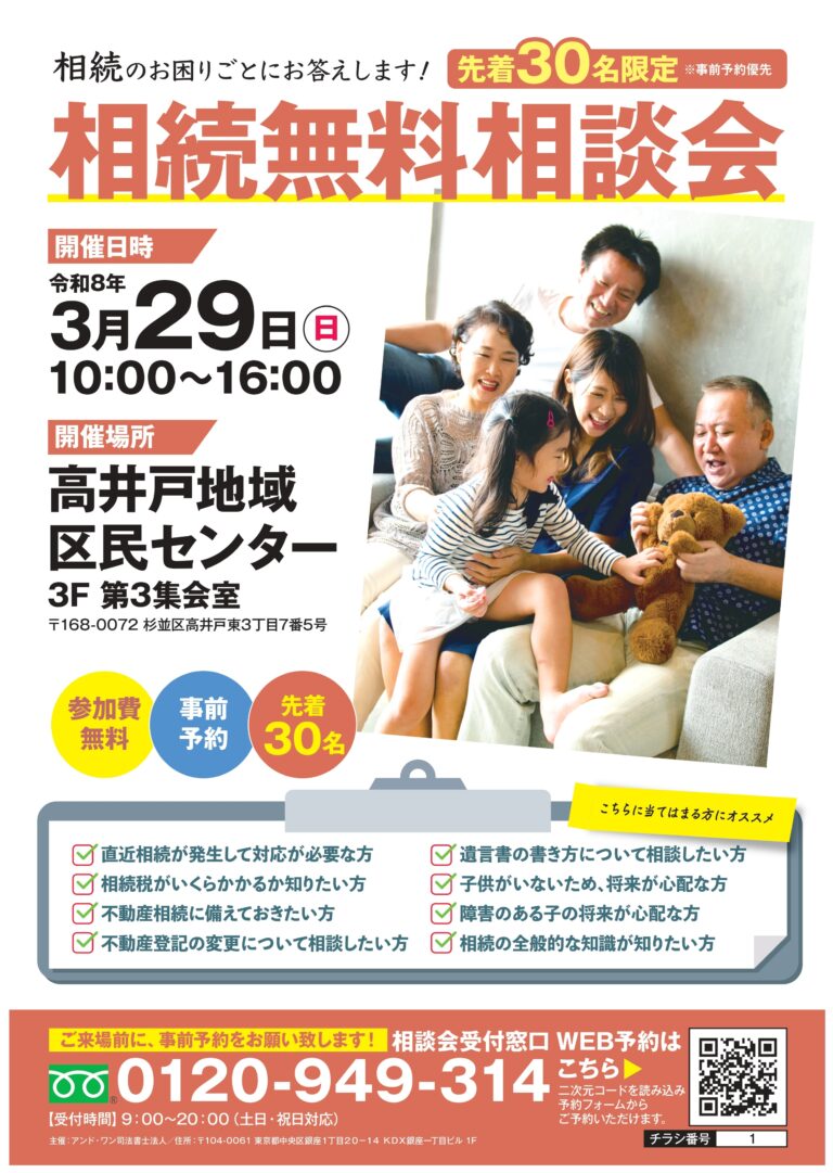 相続無料相談会を開催しました(高井戸) ― 3月29日、高井戸地域区民センターにて相続に関する無料相談会を開催いたしました。 本相談会では、相続税・不動産・遺言・生…